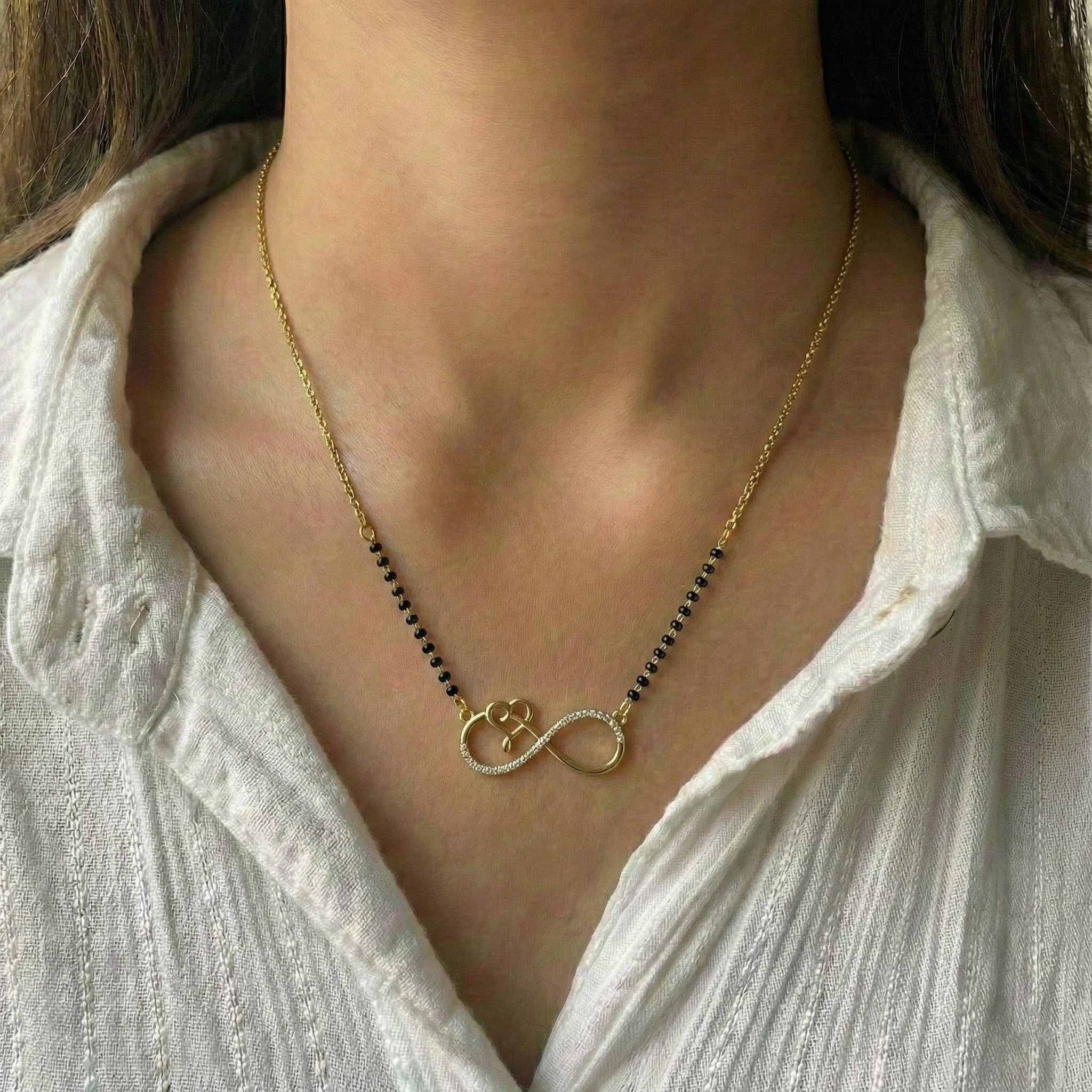 Celebrate your eternal bond with the elegant Avira Mangalsutra. The unique infinity design intertwined with a small heart symbolizes a love that never ends and stays with you forever.