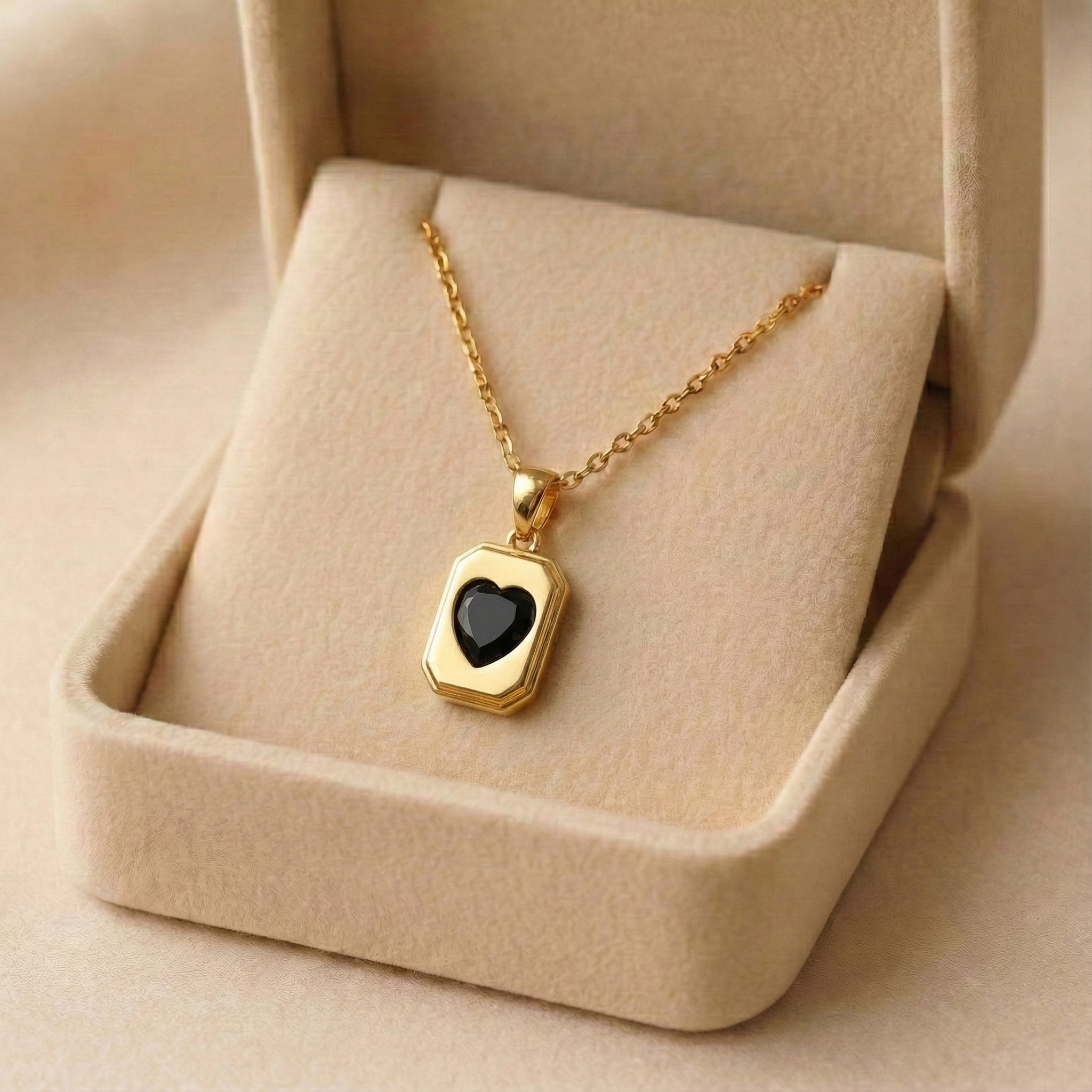 Add a bold touch to your look with our Gilded Noir Heart Frame Pendant. This elegant necklace features a deep black heart inside a polished gold frame, making it a beautiful treasure for everyday wear. It is a simple but special piece that adds a modern, elegant feel to any outfit.